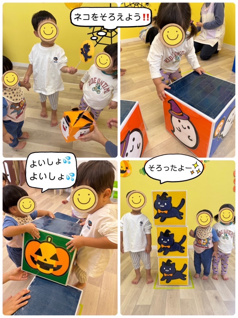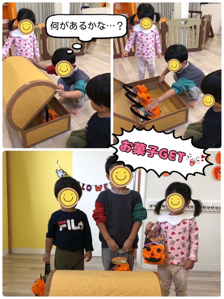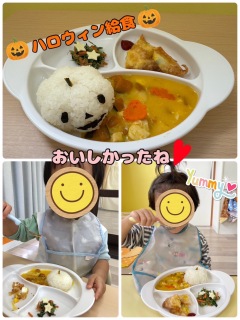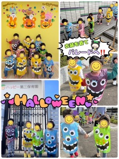 2025.10.30 【第三保育園】ハロウィンパーティー ハロウィンパーティーを行いました🎃 ハロウィンの絵本を見て、ドキドキ💓 モンスターに変身して、パレード出発‼️ カラフルなちびっこモンスターたち、とっても可愛かったです😍 1歳児さんと2歳児さんのグループで、箱つみゲームやオバケの飾り付けを楽しみました🎵 最後に宝箱を開けるとお菓子を発見👀🍭ニコニコの子どもたちでした😆 飾り付けしたオバケと記念写真📷✨ 給食はハロウィンパーティーの特別メニューを作っていただきました😋❣️ 楽しいハロウィンパーティーになりました👻🎉