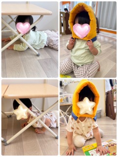 1歳児は新入園児で初めての訓練でしたが、落ち着いて防災頭巾を被ることができました。