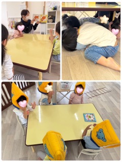 その後、机の下に入ったり、防災頭巾を被る練習をしました。